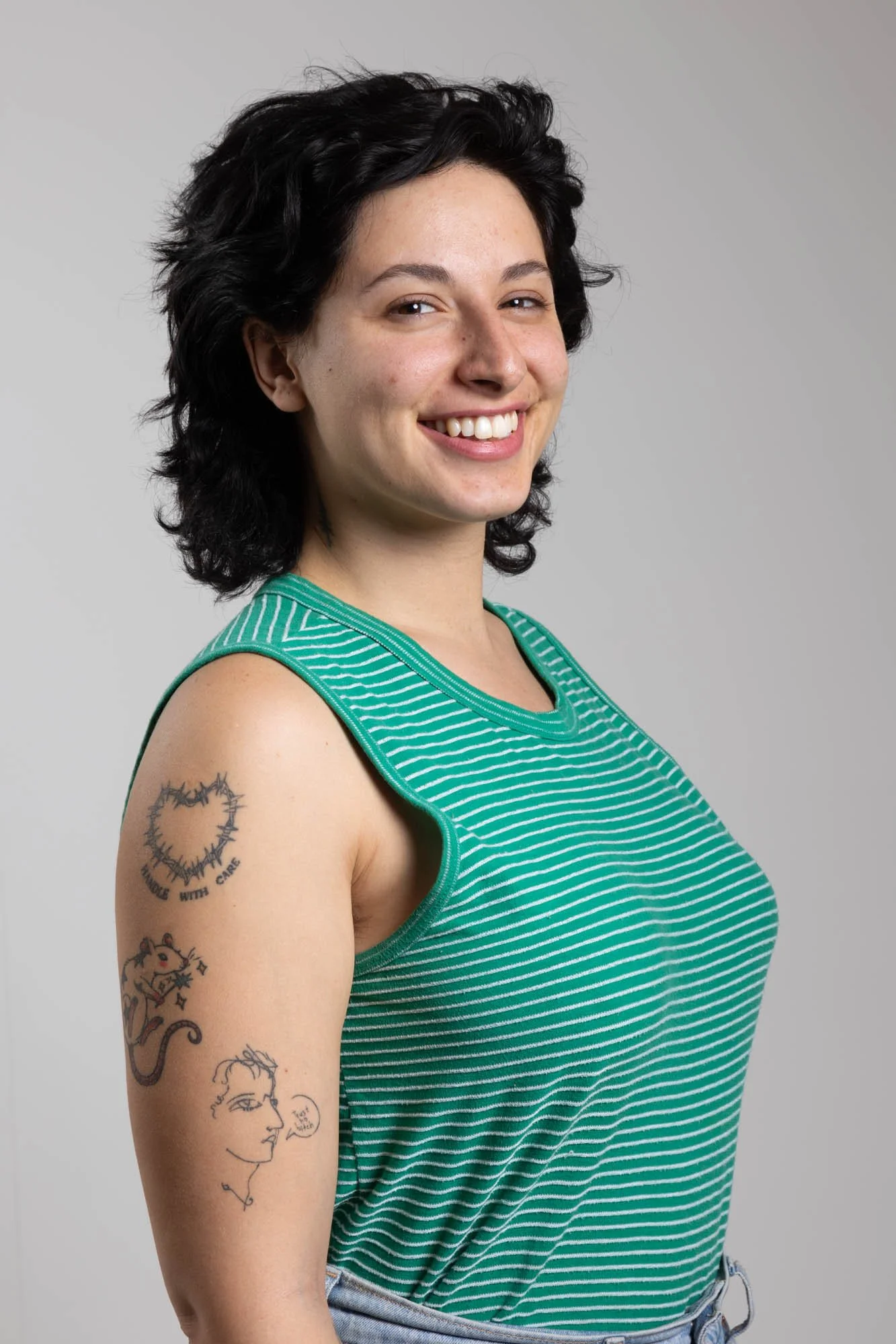 Gracias a su amplio rango de experiencias laborales, humanas y artísticas -como curadora, modelo de fotografía, dibujo y escultura, así como productora.